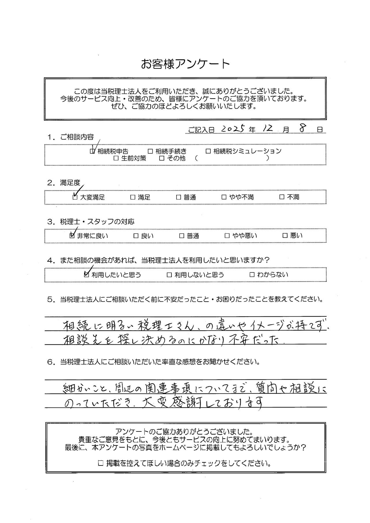 相続に明るい税理士さんの違いやイメージが持てず、相談先を探し決めるのにかなり不安だった。