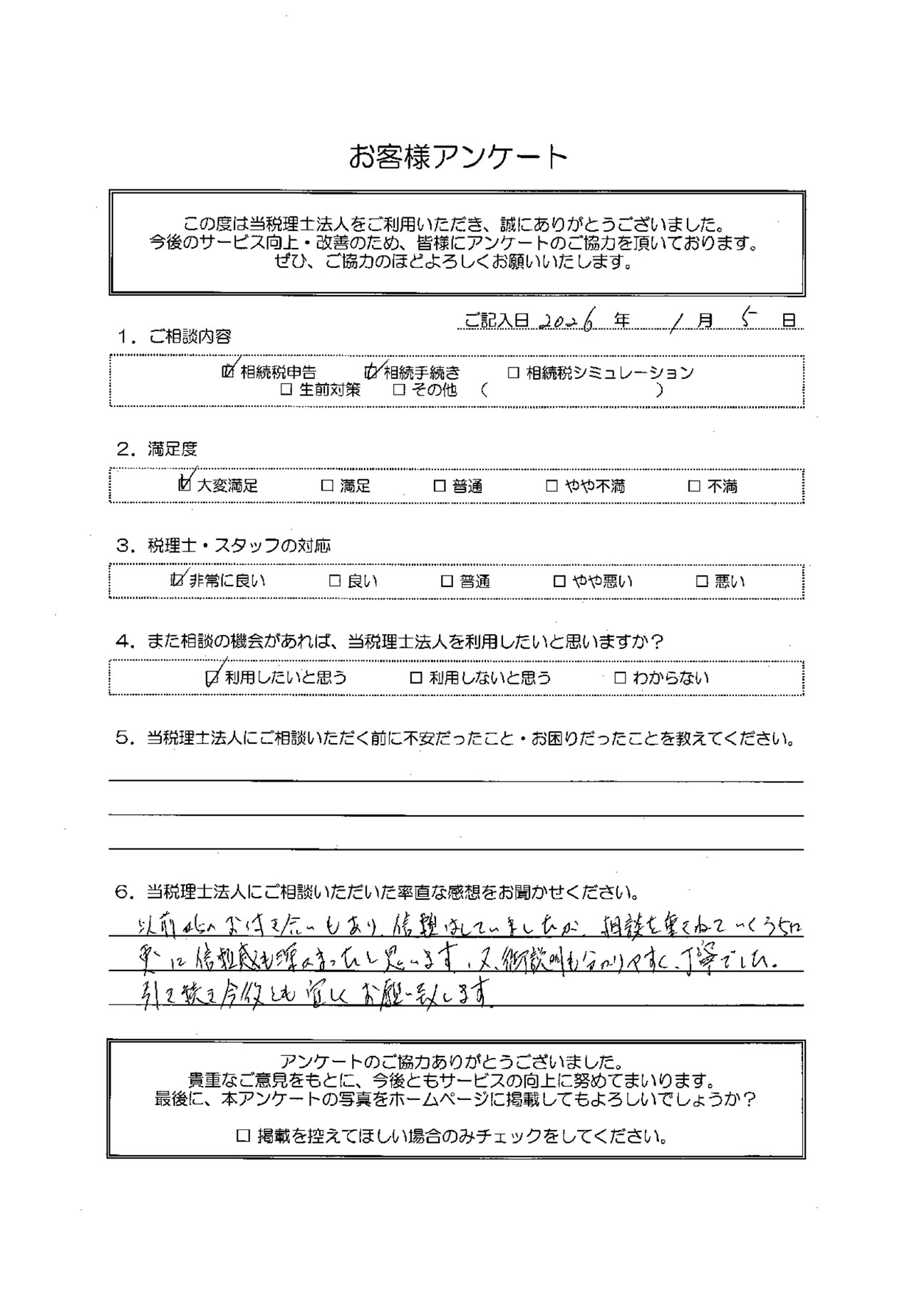 以前からのお付き合いもあり、信頼はしていましたが、相談を重ねていくうちに更に信頼感も深かまったと思います。又、御説明も分かりやすく、丁寧でした。